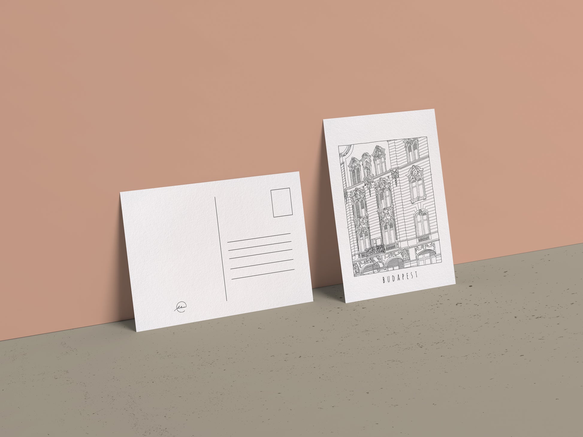 Kézzel rajzolt, egyedi képeslap, mely elvezet minket Budapest varázslatos nevezetességeihez.
